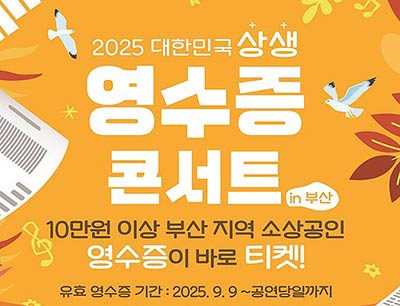 부산시는 오늘(9일) 오후 6시부터 「2025 대한민국 상생 영수증 콘서트 인(in) 부산」의 관람권(티켓) 예매를 놀_인터파크티켓(nol.interpark.com/ticket)을 통해 시작한다고 밝혔다.