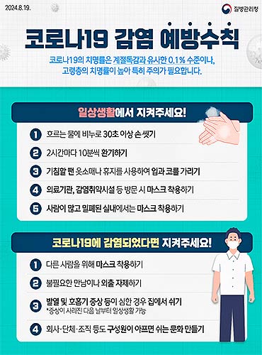 임승관 질병관리청장은 “9월에도 코로나19 확산세가 지속되는 상황으로, 국민께서는 환절기 코로나19 감염 예방을 위해, 일상 속에서 호흡기감염병 예방수칙을 생활화 하여 기억하고, 꼭 실천해달라”며, “특히, 어르신 등 고위험군은 사람이 많이 모이는 실내 행사 참여를 자제해 주시고, 참여 시에는 마스크를 착용해 주시길 바란다.”고 당부하였다.