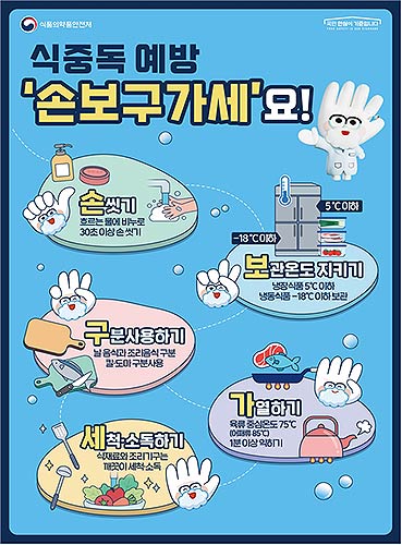 * “손보구가세”는 손씻기, 보관온도, 구분사용, 가열조리, 세척·소독 5대 예방수칙의 앞글자로 만든 식중독 예방 실천 구호
