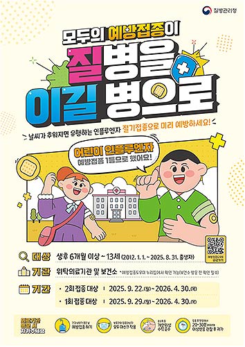 생후 6개월 ∼ 13세 어린이 (2012.1.1.~2025.8.31.) | ⦁2회 접종 대상 | 2025년 9월 22일(월) ∼ 2026년 4월 30일 |