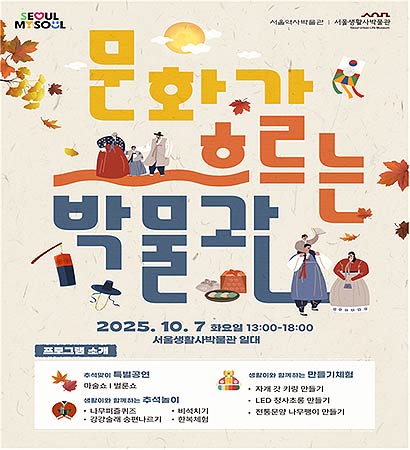 서울역사박물관은 오는 7일 오후 1시부터 6시까지 분관인 서울생활사박물관(노원구 동일로174길 27)에서 ‘추석맞이 문화행사<문화가 흐르는 박물관>’를 개최한다. 이번 행사는 추석 연휴를 맞이하여 서울생활사박물관을 찾는 시민들에게 다채로운 문화 체험의 기회를 제공하고자 마련됐다.