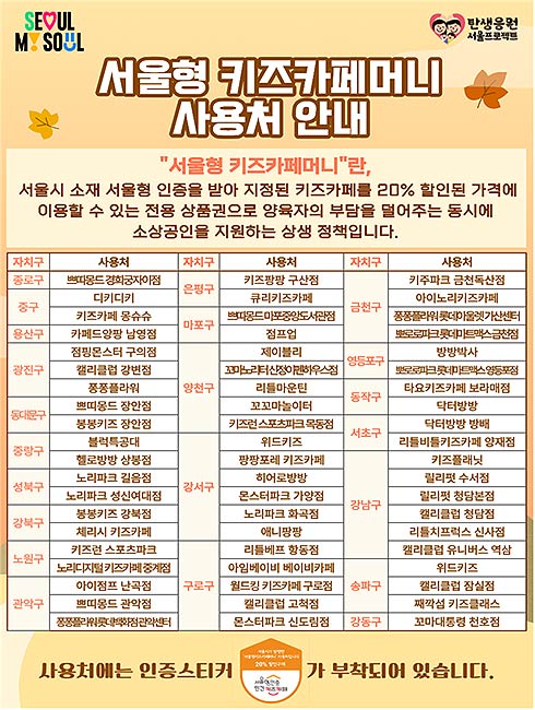 또한 해당 키즈카페에는 ‘서울형키즈카페머니’ 상품권 도어스티커 및 서울형 인증스티커가 부착되어 있어 방문자들에게 편의를 제공하고 있다.