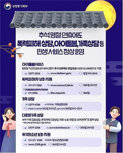 아이돌봄 서비스 | 맞벌이· 한부모가정 등의 12세 이하 아동 | 시간제, 영아종일제 돌봄 서비스 정상 제공 ★ 추석 연휴기간 평일요금 적용 | ▪(신청) 아이돌봄 누리집 (www.idolbom.go.kr)에서 신청 * 정부 지원대상(중위소득 200%이하)인 경우, 주민센터 또는 복지로 누리집 (www.bokjiro.go.kr)에 사전 신청 * 본인 전액 부담 시에는 정부지원 결정 절차 없이 바로 신청 가능 ▪(요금) 시간당 12,180원 [심야(22시∼익일 06시) 이용 시 50% 가산, 아이돌보미 활동수당은 휴일기준 지급] * 추석 연휴 기간 서비스 이용 시 사전 문의 ▪(전화) 1577-2514 |
