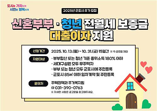군포시는 신혼부부와 청년들의 주거비 부담 경감과 안정적인 거주환경을 위해 추진 중인 '군포시 신혼부부 및 청년 전월세 보증금 대출이자 지원사업'의 지원 기준을 대폭 완화하고 이에 따라 추가 지원 대상자를 모집한다고 밝혔다.