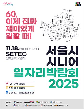 서울시는 오는 11월 18일(화) SETEC(강남구)에서 「서울시 시니어 일자리박람회 2025」를 개최한다. 초고령사회 대응 종합대책 ‘9988 서울 프로젝트’의 하나로 마련된 이번 박람회에서는 시니어들이 쌓아온 경력과 전문성을 살려 경제적 자립을 이루고 사회참여를 확대할 수 있도록 다양한 프로그램이 진행된다.