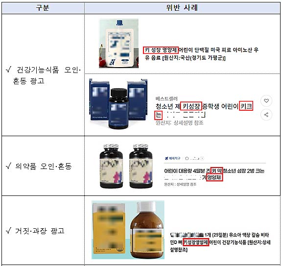 위반 내용은 ▲‘키 성장 영양제’, ‘청소년 키성장’, ‘중학생 어린이 키 크는’ 등 일반식품을 건강기능식품으로 오인·혼동시키는 광고 122건(79.7%) ▲‘키성장’ 등 인정하지 않은 기능성을 내세운 거짓·과장 광고 16건(10.5%) ▲‘키 약’ 등 식품을 의약품으로 오인·혼동하게 하는 광고 8건(5.2%) ▲‘성조숙증’ 등 질병 예방·치료 표방 광고 6건(3.9%) ▲체험기 등 소비자를 기만하는 광고 1건(0.7%) 등이다.