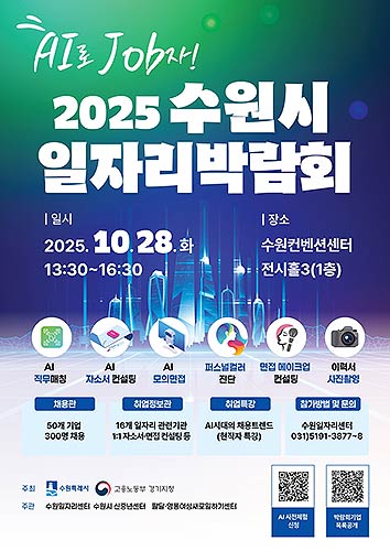 수원특례시와 고용노동부 경기지청은 10월 28일 오후 1시 30분부터 4시 30분까지 수원컨벤션센터 전시홀에서 'AI로 JOB자-2025 수원시 일자리박람회'를 개최한다.