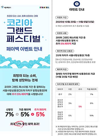 서울시는 오는 10월 29일(수)부터 11월 9일(일)까지 12일간 열리는 ‘코리아 그랜드 페스티벌(Korea Grand Festival)’ 기간 동안, 서울시 25개 자치구 서울사랑상품권으로 결제하면 결제금액의 5%를 추가로 페이백하는 행사를 추진한다고 밝혔다.