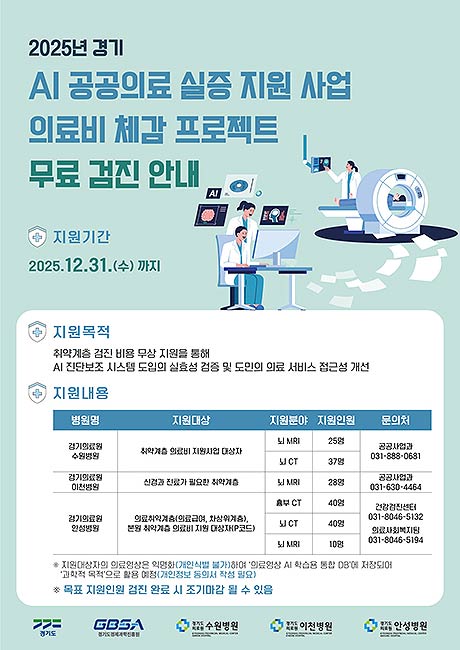 도는 올해 12월 말까지 경기 남부 지역의 공공의료원(수원·안성·이천병원)에서 AI 진단보조시스템을 활용한 무료 의료영상 촬영 및 검진 캠페인을 진행한다. 대상은 취약계층과 의료급여 수급자 180여 명으로, CT·MRI·X-ray 촬영과 판독 지원이 포함된다.