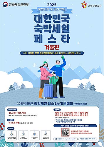 문화체육관광부(이하 문체부)는 한국관광공사(이하 관광공사)와 함께 11월 3일(월)부터 12월 7일(일)까지 2025년 하반기 숙박세일페스타 ‘겨울편’을 진행한다. 이번 행사는 ‘희망이 되는 소비, 함께 성장하는 경제’라는 비전 아래 열리는 국가 단위 소비 축제 ‘코리아 그랜드 페스티벌(Korea Grand Festival)’과 연계, 겨울 여행 수요를 확대하기 위해 추진하는 것이다.