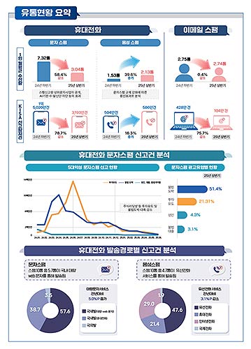 특히 휴대전화 문자스팸(3.04통)은 최근 5년 내 최저 수치를 기록했으며, 휴대전화 문자‧음성스팸 신고‧탐지량(총 3,779만 건)도 최근 2년 내 최저치다.