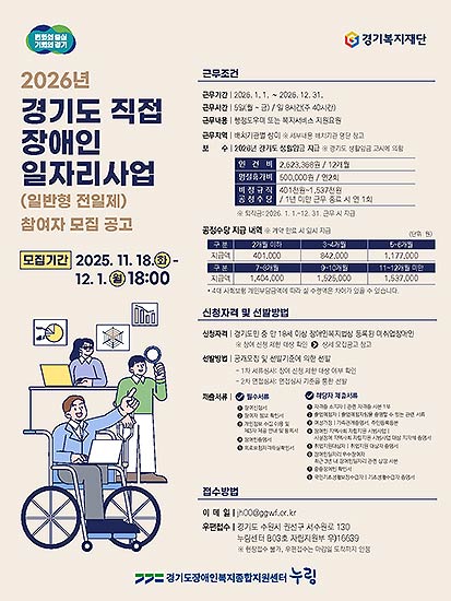 경기도장애인복지종합지원센터(이하 누림센터)는 11월 18일부터 12월 1일까지 ‘2026년 경기도 직접 장애인일자리 사업’ 참여자를 모집한다.