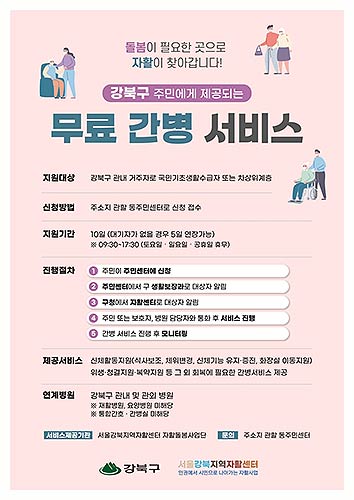 서울 강북구는 질병이나 사고로 일시적인 돌봄이 필요한 저소득 구민을 위해 '무료 간병 서비스'를 지원한다.