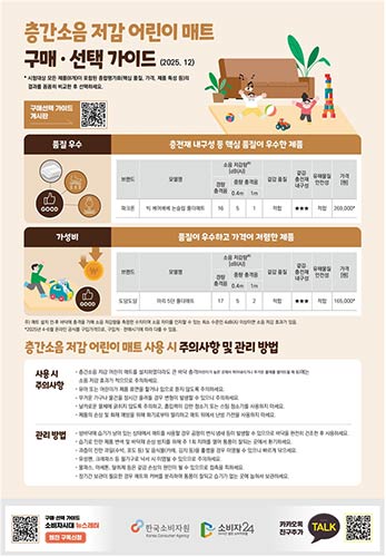 이에 한국소비자원(원장 윤수현)이 층간소음 저감 어린이 매트(4cm 두께⋅폴더형) 8개 제품의 품질(소음 저감 성능, 겉감⋅충전재 내구성 등)과 안전성(유해물질) 등을 시험평가했다.