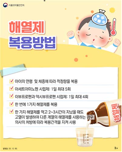 • 식품의약품안전처 소속 식품의약품안전평가원은 겨울철에는 고열이 동반된 감기 및 독감 환자의 해열제 사용이 늘어남에 따라, 소아 해열제의 올바른 사용방법을 안내한다고 밝혔다.