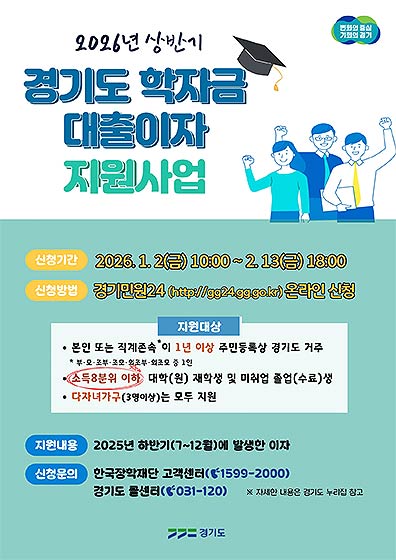 경기도가 오는 2월 13일까지 ‘2026년 상반기 경기도 대학생 학자금 대출이자 지원사업’ 신청자를 접수한다.