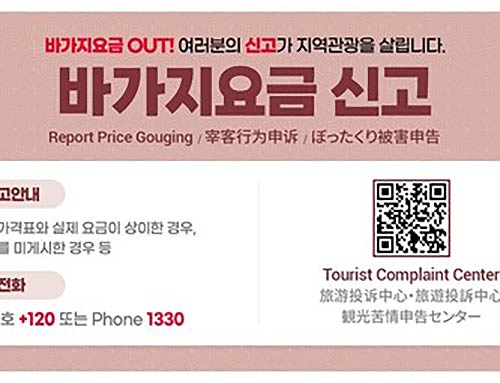 「바가지요금 큐알(QR) 신고」 시스템은 국내외 관광객이 큐알(QR)코드를 스캔해 바가지요금을 즉시 신고할 수 있는 시스템이다. 신고 내용은 한국관광공사(1330)를 통해 소관 기관(관할 지자체, 유관기관 등)으로 전달된다.