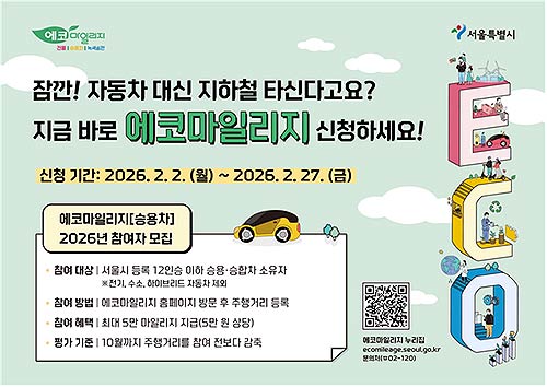서울시가 시민들의 탄소중립 실천을 지원하는 에코마일리지 ‘승용차 마일리지’ 제도의 2026년 참여자를 2월 2일부터 27일까지 모집한다. 참여 시민은 10월까지 자동차 주행거리를 줄이면 최대 5만 마일리지(5만 원 상당)를 받을 수 있다.