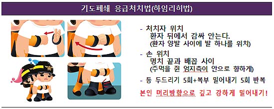 기도폐쇄 응급처치법(하임리히법)은 기도막힘 증상을 호소하는 환자를 뒤에서 감싸 안고, 명치끝과 배꼽 사이를 주먹을 쥔 채 힘껏 밀어 올려 기도에 걸린 이물을 배출하는 응급처치법이다.