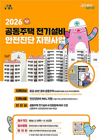 • 서울시는 노후 공동주택의 정전사고를 사전에 차단하고, 시민 생활안전을 강화하기 위해 ‘2026년 공동주택 전기설비 안전진단 지원사업’을 추진한다. 한국전기안전공사와 협력해 공동주택 전기설비의 적정 운전․관리 상태를 종합 진단하고, 진단비의 90%를 지원한다.