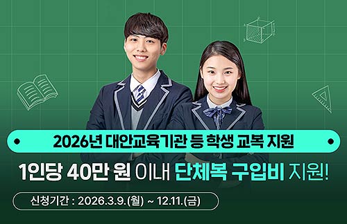 경기도는 시군과 협력해 교복, 체육복 등 단체복 구입비 최대 40만 원을 지원한다. 지원 대상은 입·전학일 기준 경기도에 주민등록을 둔 도 내·외 대안교육기관 중·고등학교 1학년 입학생과 다른 시도에 소재한 중·고등학교 1학년 입학생이다.