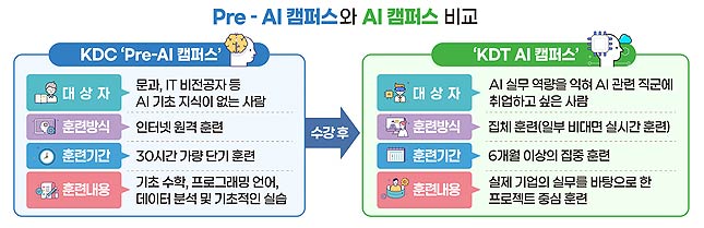 한편, ‘Pre-AI 캠퍼스’ 과정은 100% 온라인 직업훈련인 ‘K-디지털 기초역량훈련(KDC, 붙임3)’의 세부 과정으로 국민내일배움카드 발급자에게는 정부가 훈련비의 90%를 지원하며(최대 지원액 50만원), 수강생 본인부담금은 5만원 내외이다.