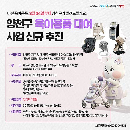 이용 대상은 양천구에 거주하거나 양천구에 직장, 사업장, 학교 등 생활권을 두고 있는 0∼24개월 영아 가정으로, 연회비 1만 원만 부담하면 모든 육아용품을 대여할 수 있다.