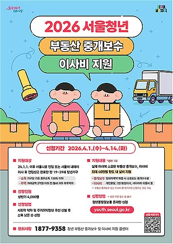 서울시가 2026년 상반기 ‘청년 부동산 중개보수 및 이사비 지원사업’ 참여자 4,000명을 4월 1일(수)부터 14일(화)까지 모집한다.