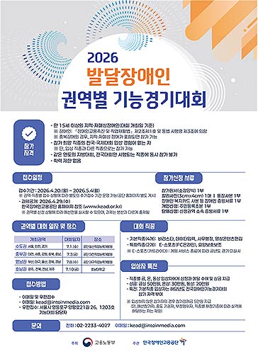 고용노동부가 주최하고, 한국장애인고용공단이 주관하는 「2026년 발달장애인기능경기대회」 원서접수를 4.20.(월)부터 5.4.(월)까지 진행한다.