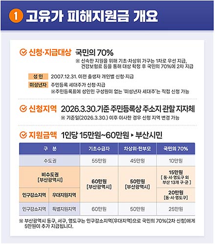 부산시는 고유가․고물가로 인한 시민 부담을 완화하고 지역 경제 회복을 지원하기 위해 4월 27일부터 5월 8일까지 '고유가 피해지원금' 1차 지급을 개시한다고 밝혔다. 이에 따라 기초생활수급자는 60만 원, 차상위·한부모 가구는 50만 원을 지급받게 된다.