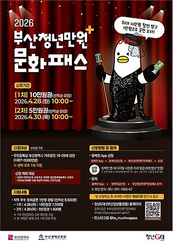 부산시는 부산 청년들만 누리는 '최고 가성비' 문화생활 지원사업인 '부산청년만원 문화패스' 신청을 오는 4월 28일 오전 10시부터 동백전 앱을 통해 선착순으로 접수한다고 밝혔다.