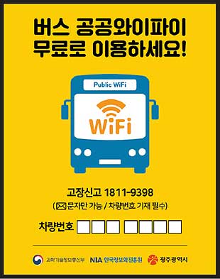 광주광역시는 전국 최초로 관내 101개 노선 1044대(예비버스 포함) 모든 시내버스에 누구나 무료로 이용할 수 있는 공공와이파이 서비스를 시범 운영한다.