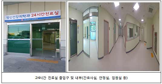 또한 24시간진료실 환자들의 외부자극 최소를 위하여 보호자 및 대기실을 입구에 따로이 마련하고, 진료공간․입원병실을 분리하여 급성기 정신질환자 및 직원의 안전까지 보호 할 수 있도록 하였다.