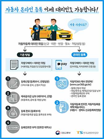 국토교통부(장관 김현미)와 한국교통안전공단(이사장 권병윤)은 오는 7월 15일부터 차량 구입 시 발생하는 불편해소를 위해 “대리인도 자동차 온라인 등록을 이용할 있도록 서비스를 개선했다”고 밝혔다.
