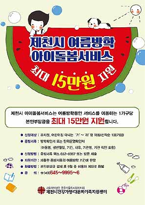 제천시는 여름방학을 맞아 자녀가 유치원과 어린이집에 다니는 맞벌이 가정에 '아이돌봄서비스' 비용을 최대 15만 원까지 무료지원한다고 밝혔다.