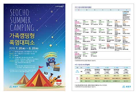 운영 기간 구청과 내곡느티나무쉼터에서 주민들의 사생활을 보호할 수 있는 실내용 텐트를 비롯해 ▲지역 내 예술가들의 꽃자리콘서트 ▲'주토피아', '수상한 그녀' 등 가족영화 상영 ▲북카페 ▲IT체험존 ▲보드게임 등 다양한 볼거리, 즐길 거리를 함께 제공해 가족과 여름 캠핑을 온 듯한 추억을 선사할 계획이다.
