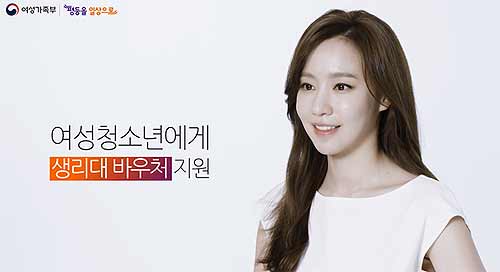 여성가족부(장관 진선미)는 배우 김아중이 재능기부로 출연한 저소득가정 여성청소년(만11세~만18세) 생리대 지원 사업 홍보영상을 제작하였다.