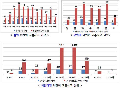 보행 중 사고가 377건(87%)으로 대부분을 차지했고 주로 방과 후 집으로 귀가하거나 학원으로 이동하는 시간대인 오후 2시에서 6시 사이에 239건(55%)으로 가장 많이 발생했다.