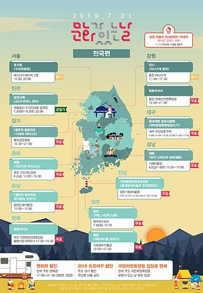 매달 마지막 수요일은 국민들이 일상에서 문화를 더욱 쉽게 접할 수 있도록 하기 위해 문화체육관광부(장관 박양우, 이하 문체부)가 지정한 ‘문화가 있는 날’이다. 2019년 7월 ‘문화가 있는 날’(7. 31.)과 해당 주간(7. 29.~8. 4.)에는 전국에서 문화행사 2,429개가 국민들과 만날 예정이다.