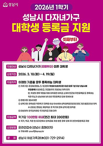 성남시, 셋째 이상 대학생에 '학기당 최대 100만 원' 등록금 지원